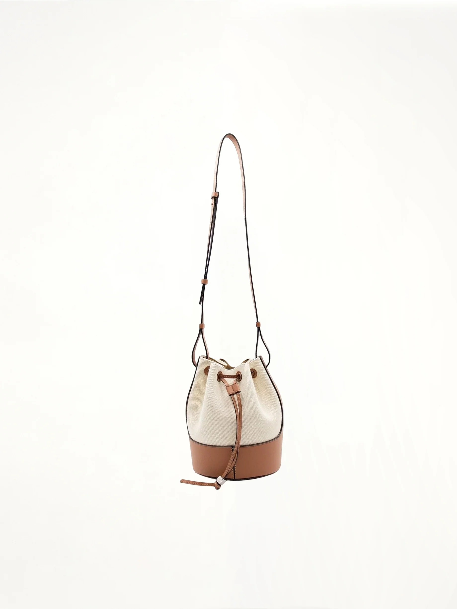Small balloon bag in ecru tan calfskin leather and canvas lining with drawstring closure and adjustable shoulder strap